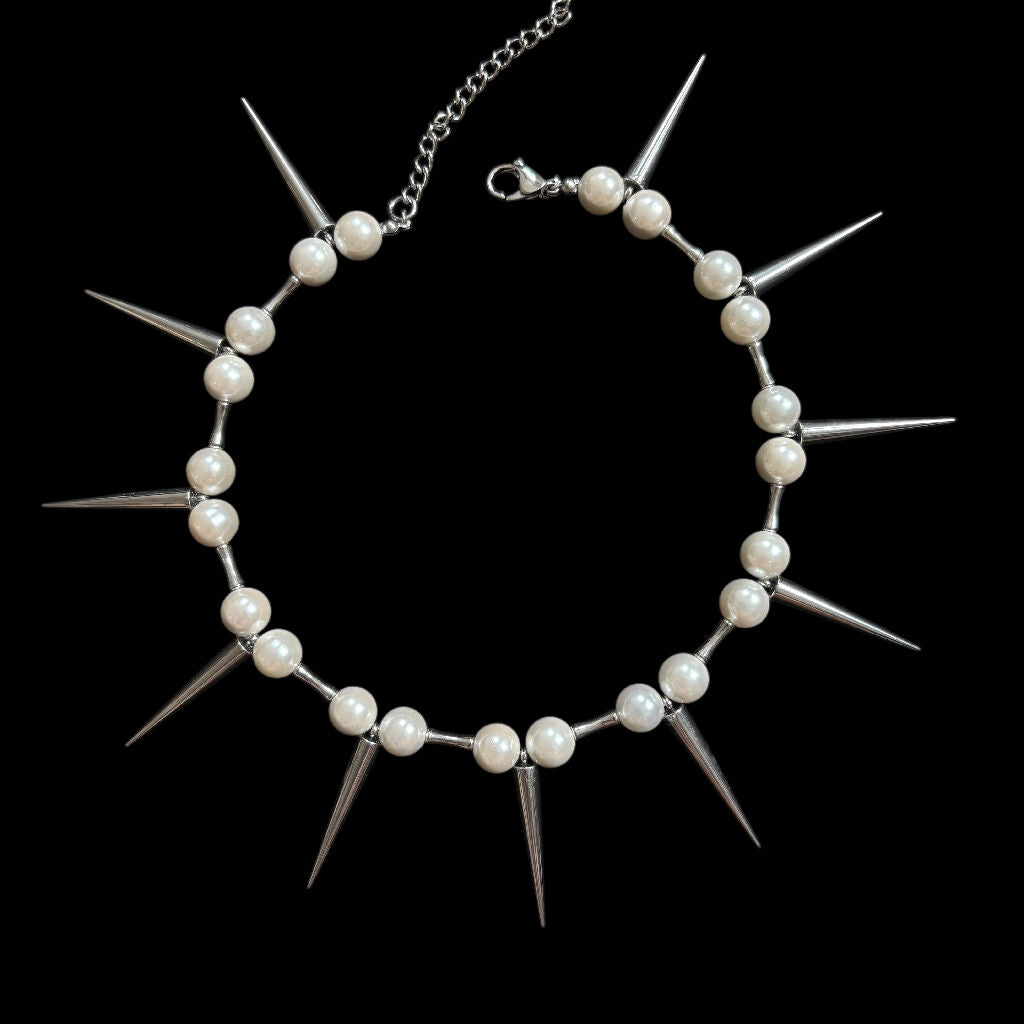 A bold fusion of elegance and edge — this choker features smooth white shell pearls paired with sharp stainless steel spikes. Perfect for making a statement, it’s both classic and rebellious.