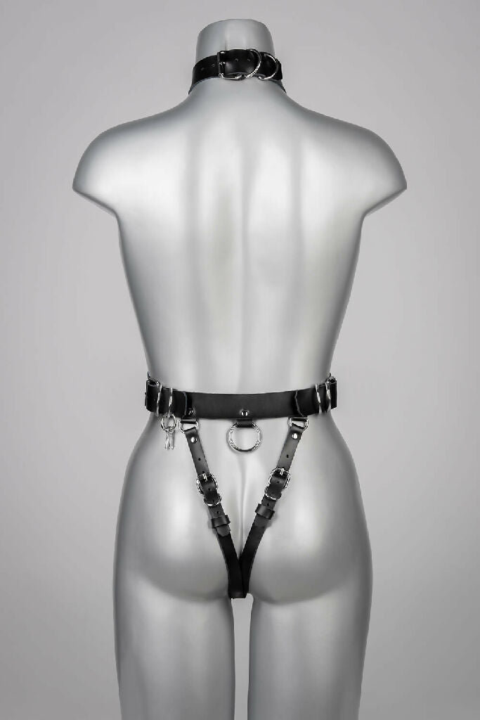 The leather body harness – Secured is designed to be worn with seductive stockings or paired with matching thigh cuffs. Transform the leather body into a daring playsuit by unclipping the garterbelt straps for an unforgettable erotic night. For a more modest approach, layer with sheer mesh for a sensual yet dressed-up look.