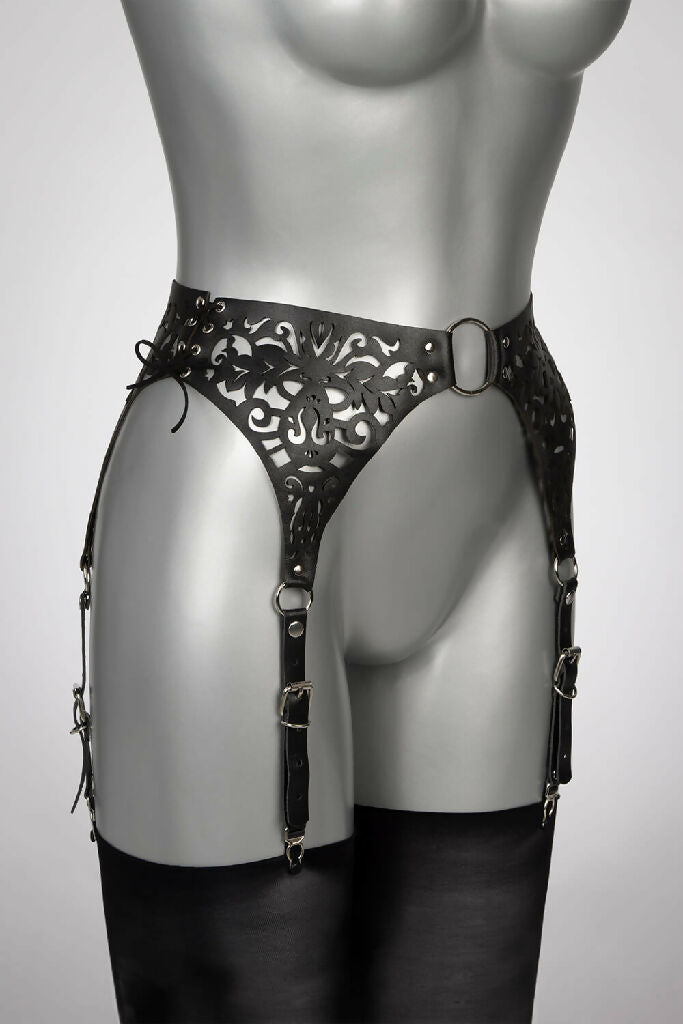The leather garterbelt is pressed and cut in a particular manner, creating delicate yet super strong gossamer connections. The adjustable strap at the back allows for an adjustable fit from size S to XL.The supple calf leather provides a comfortable feeling on your skin