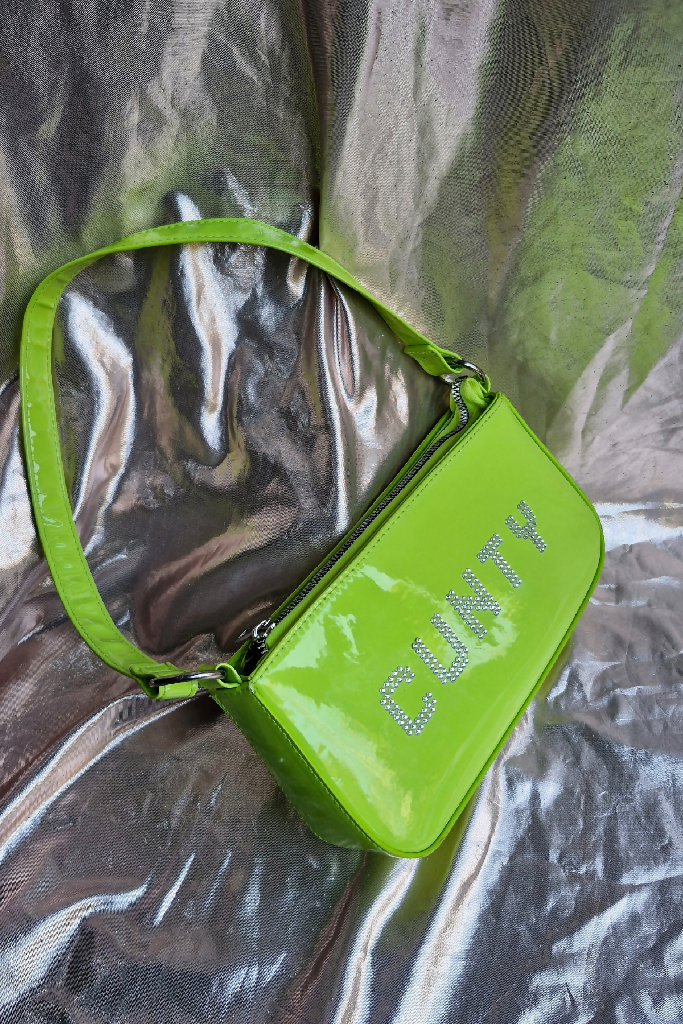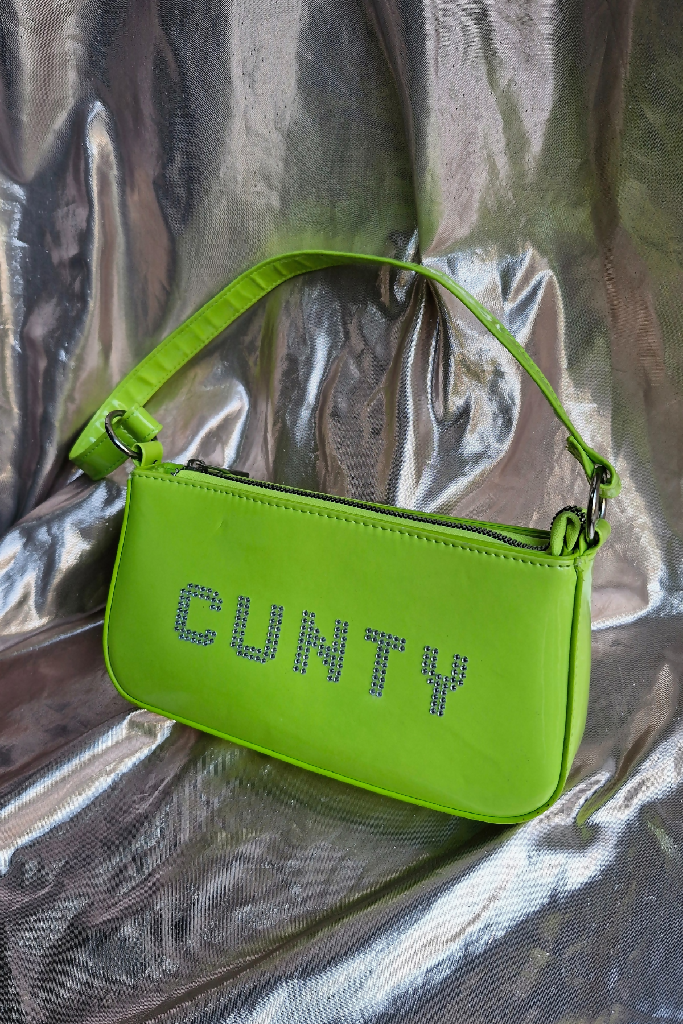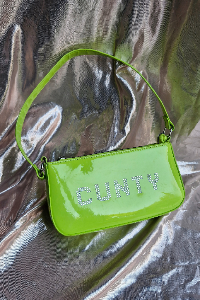 "CUNTY" Upcycled Neon Brat Green Rhinestone Y2K Handbag