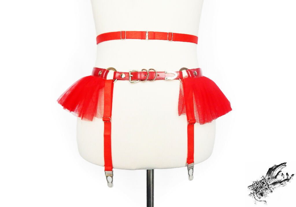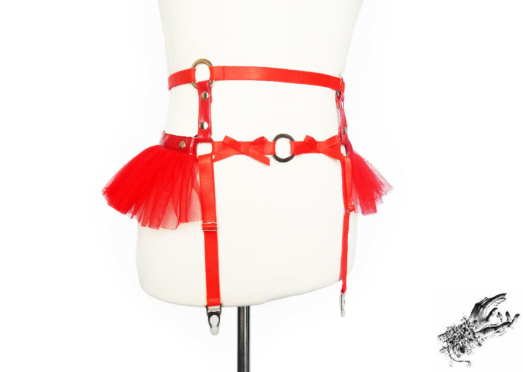 Made with red faux leather, satin faced elastic, mesh tulle, satin ribbon and stainless steel plated hardware. The garter belt is adjustable at the waist and hips, and each faux leather end is finished with a stainless steel plated cap. The harness is made of the highest quality vegan friendly materials. The harness comes in a variety of sizes listed below.