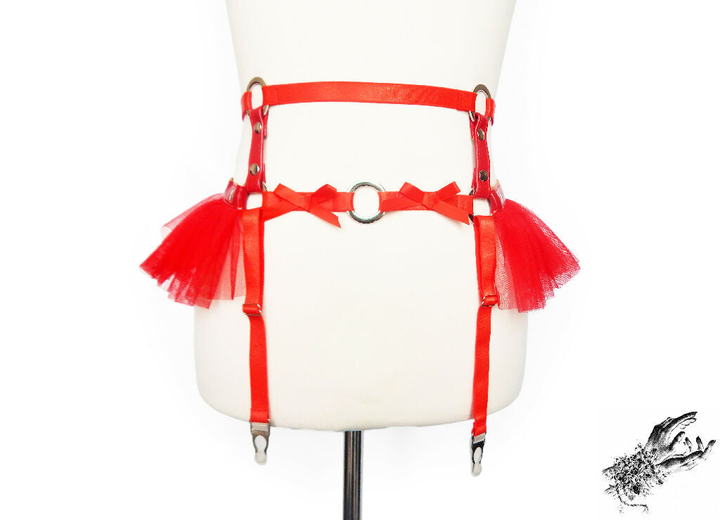 This is a red faux leather garter belt featuring a silver O ring and ruffled tulle at the hips. This vegan O ring garter belt is fashionable yet playproof, can be worn as lingerie or fashion wear and is available in black, white, pink and red vegan leather.