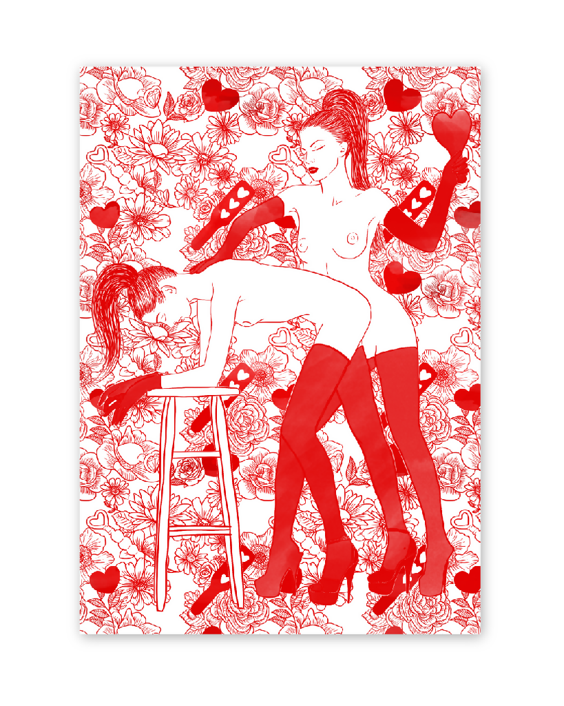 Red for red cheeks! This erotic spanking illustration features a cheeky floral background print and a beautiful pair in stockings and gloves.