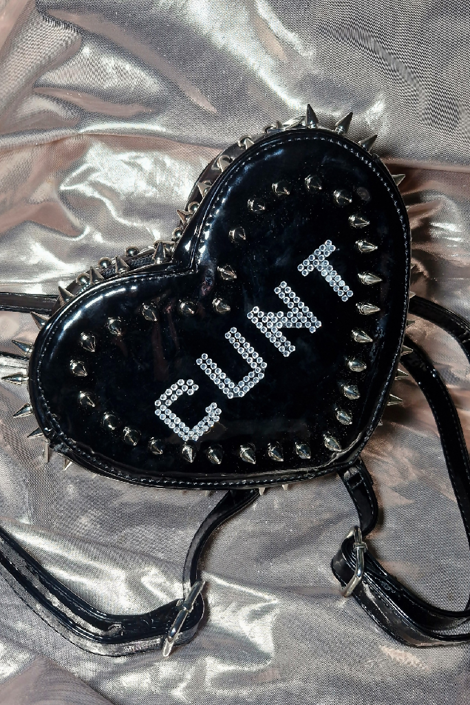 This glossy, jet-black heart is dripping in spikes and attitude. This bag features rhinestone lettering that dares to reclaim what’s taboo, transforming it into pure, unapologetic art.