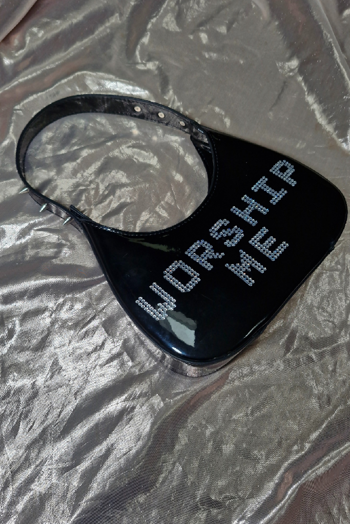 Unleash your inner goddess with our best-selling "Worship Me" custom handbag in pvc with a naughty silver chain.