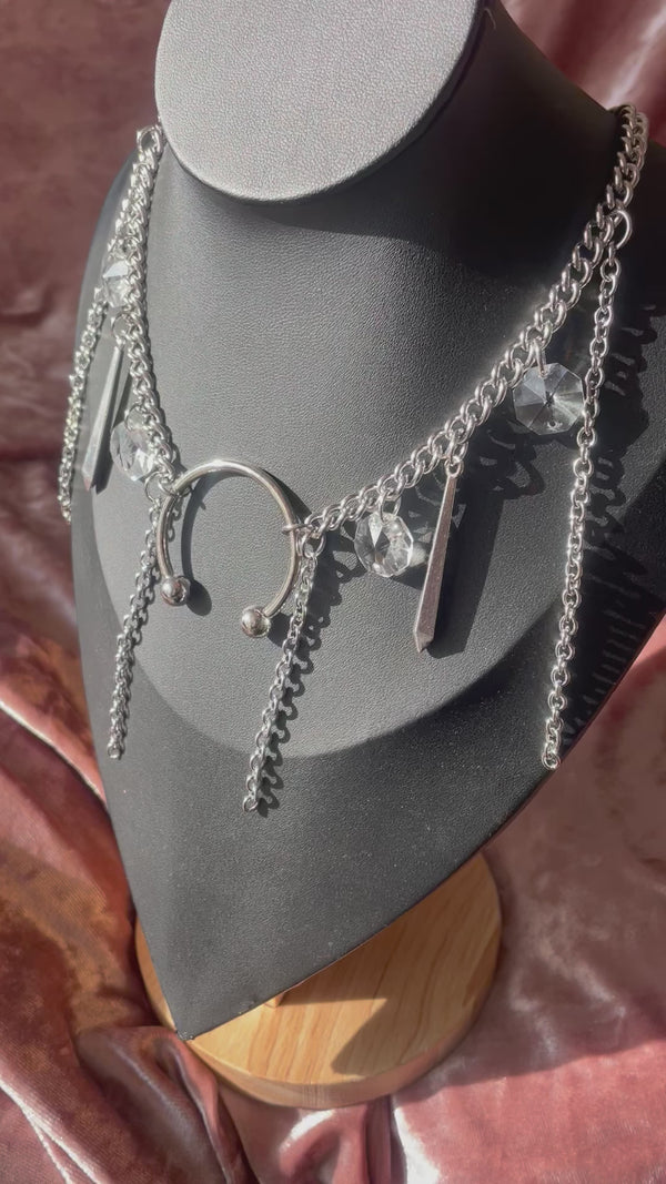 Stainless steel necklace decorated with piercing charm ,dangling chains and crystals